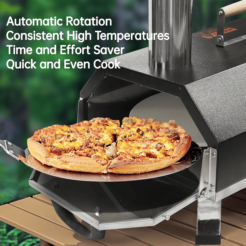 SKU: 0087164512 Inch Automatic Rotating Pizza Oven, Portable Wood Burning Pizza Oven with Built-in Thermometer, Outdoor Kitchen Authentic Stone Baked Pizza, Freestanding Carbon Grill, Pizza Stone with Wheels, and Oven with Chimney. Ceramic Stone Pizza Oven and Toaster for Patio/Camping Outdoor Cooking, Black