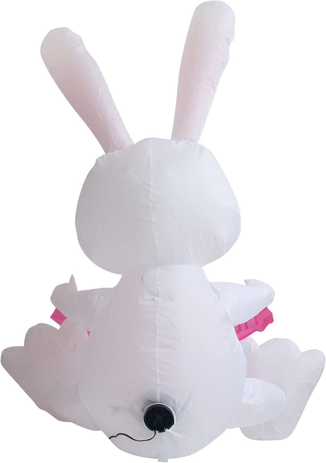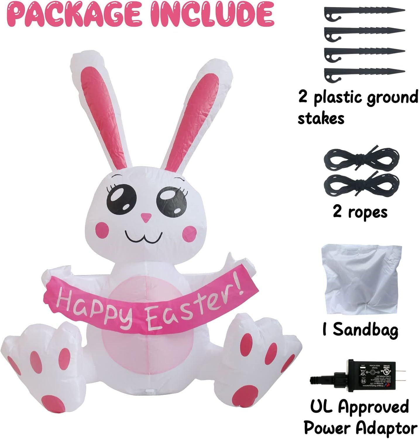 [Material Durable & Waterproof]Easter inflatable bunny height 3.8 feet. The material is waterproof polyester, have a certain thickness, which is strong and durable. Not easy to be pierced by sharp and hard things, don't worry about it on the grass outdoors.[Package Included]This Easter blow up yard decoration includes 1x inflatable decoration, 1x strong wind pump, 1x safety power adapter(The cord is 10 feet long), long enough to place the inflator anywhere in the yard, 4x plastic stakes, and 2x ropes.[Easy to Use and Install]This Easter Inflatable Outdoor Decorations solid, easy to install, put it on the ground, zip up the bottom zipper, connect the power supply, self-inflatable in minutes. Then use the rope and stakes fixed the device. Built-in sandbags will also keep the inflator stable, so it won't blow away.[Self-Inflatable in Minutes]The Easter decorations equipped a powerful blower, just plug it in, the Easter decoration will self-inflatable in minutes, and keep inflatable a long time. It is efficient and inflated quickly.[Built-in Super Bright LED lights]The built-in super bright LED lights emit eye-catching lights even at night. When Easter arrives, the inflatable easter bunny will create a festive atmosphere, making life full of ritual. It can attract more neighbors and friends and it is a great holiday party decoration. It is an ideal Easter decorations for courtyard, garden, lawn and interior.