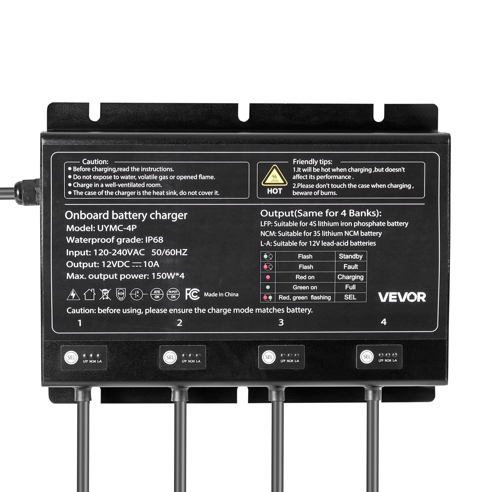 Marine Battery Charger: This marine battery charger provides a stable 4-bank 12V/10A output, compatible with lead-acid and lithium-ion batteries. Three charging modes (LFP, NCM, L-A) ensure efficient, secure charging for various battery types