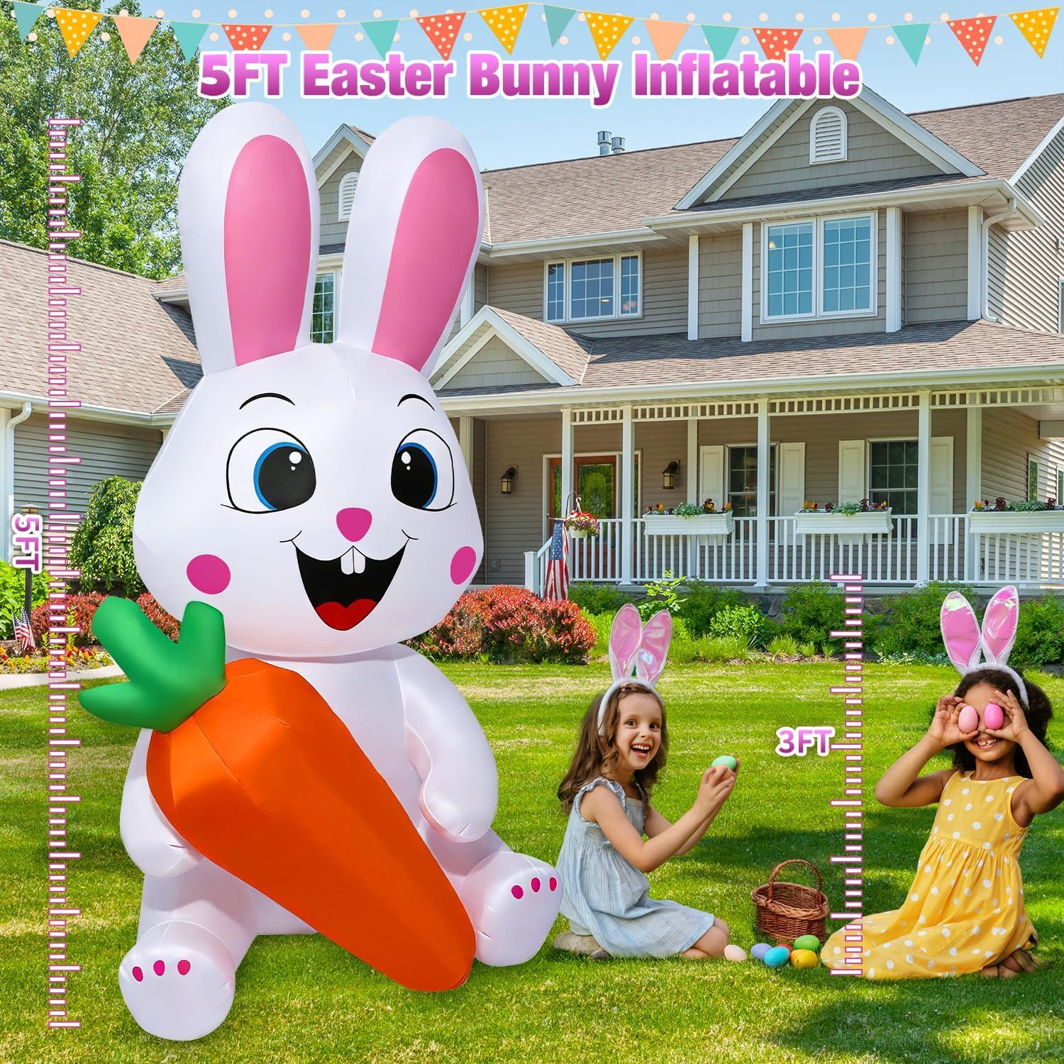 [5FT Easter Bunny with Carrot Inflatables] Anyone looking forward to Easter will be excited to see a lovely bunny holding carrot with a huge warm smile on her face. The energetic spirit and happy expression of the easter inflatable are infectious, making it the perfect greeter for guests during the holiday season. Easter decorations create a joyful and warm holiday celebration.[Built in LED Lights]With internal super bright LED lights, the colored easter inflatable bunny lights up for eye-catching nighttime viewing. Lit up your lawn or garden and attract neighbors and guests.Our Easter outdoor decoration is the perfect ornament for the front yard display.[Weather Resistant Material]Easter Day decorations adopt high-strength tear-resistant waterproof polyester and are 100% hand-sewn by skilled workers, perfect for indoor and outdoor outside decoration. Equipped with a powerful blower and UL-certified plug, just plugin and the easter inflatable decoration will pop out in seconds![Easy Installation & Stable Device]The 6.6FT power cord of the blower helps you place the easter inflatable anywhere in easter decorations for home. The attached 4 stakes, 4 ropes can fix the easter decor on the ground and keep it upright firmly, zip up the bottom zipper to avoid air leakage, and open for fast deflation[Joyful Easter Decorations] This 5 FT outdoor Easter decoration is suitable for indoor, outdoor, patio, garden, easter party. Equipped with super bright LED lights, easter baskets can attract everyone's attention, bringing a pleasant atmosphere to neighbors, friends, and family and perfect for kids and family photos and memories. It's perfect for Easter and party celebrations.