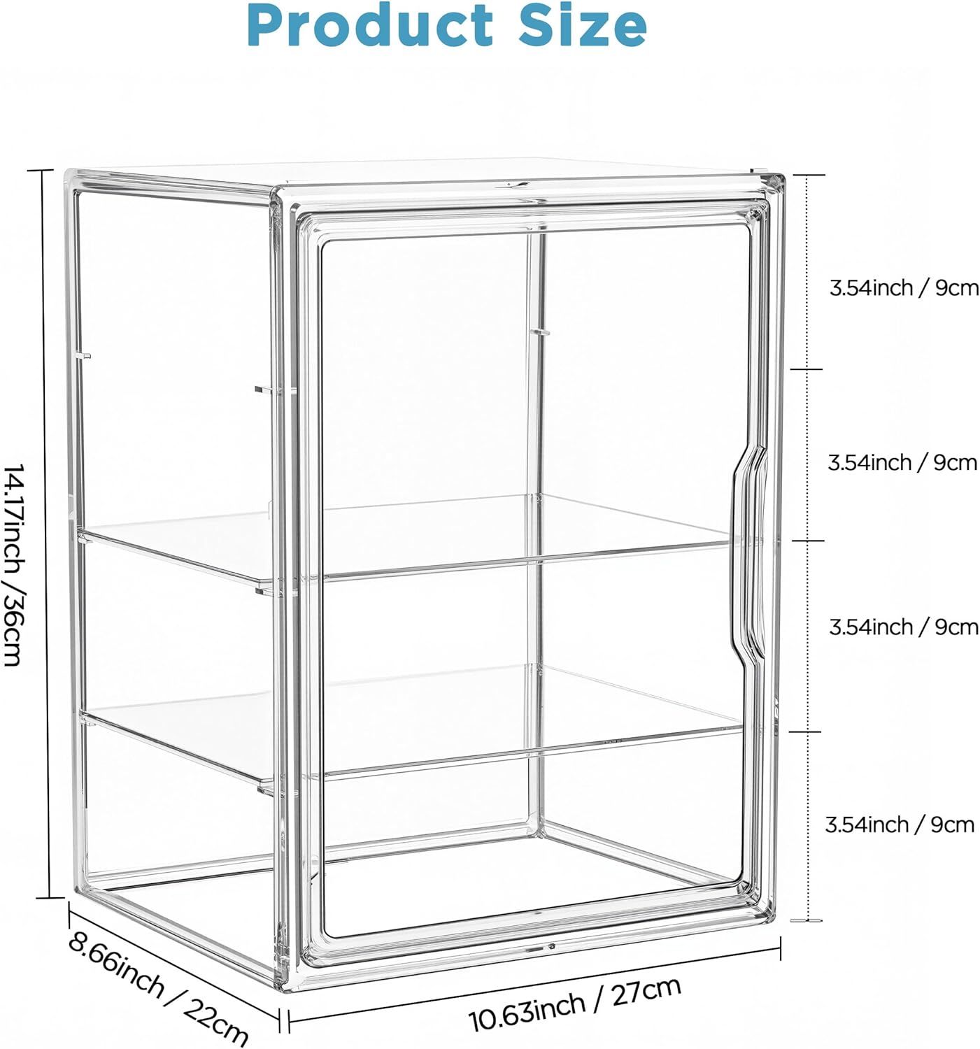 Large Capacity & Smart OrganizationSize:10.63*8.66*14.17inch,can hold all baby bottles and feeding accessories. All-in one 3-tier baby bottle storage organizer classify bottles, nipples, bump parts, pacifiers and accessories to store, which keeps baby newborn feeding essentials neatly stored in one place.Ready for the next feed!Adjustable DesignEach storage bin with lids features 3 grooves and 2 removable dividers,allow you to flexibly divide the space for different-sized baby bottles, lotions baby meds, toys and items,from baby feeding accessories,collectibles to household goods.Convenient Magnetic door The magnetic closure on this baby bottle organizer enables quick access to your baby bottles accessories while keeping dust out;Its effortless open-and-close mechanism combines practical functionality with a sleek design.Extra silicone pads are included, just stick them on the bottom of the box for non-slip,the box will not move when opened.Your Breastfeeding Space SaverSay goodbye to space anxiety! This compact baby bottle storage station neatly stores all your baby's bottles and accessories, saving precious counter space and keeping your kitchen clutter-free. You can use these stackable baby bottle storage box for countertop, cabinet, under sink, pantry shelf.High-grade Acrylic MaterialOur acrylic organizer are clear,you can quickly find what you want without searching or marking it.And they protect containers from dust, moisture and etc, which keeps baby feeding accessories safe, clean.Perfect Baby Shower Gift: Sets up in just 2 minutes (no tools needed!) and grows with your baby from newborn to weaning stage—an ideal gift for new parents.
