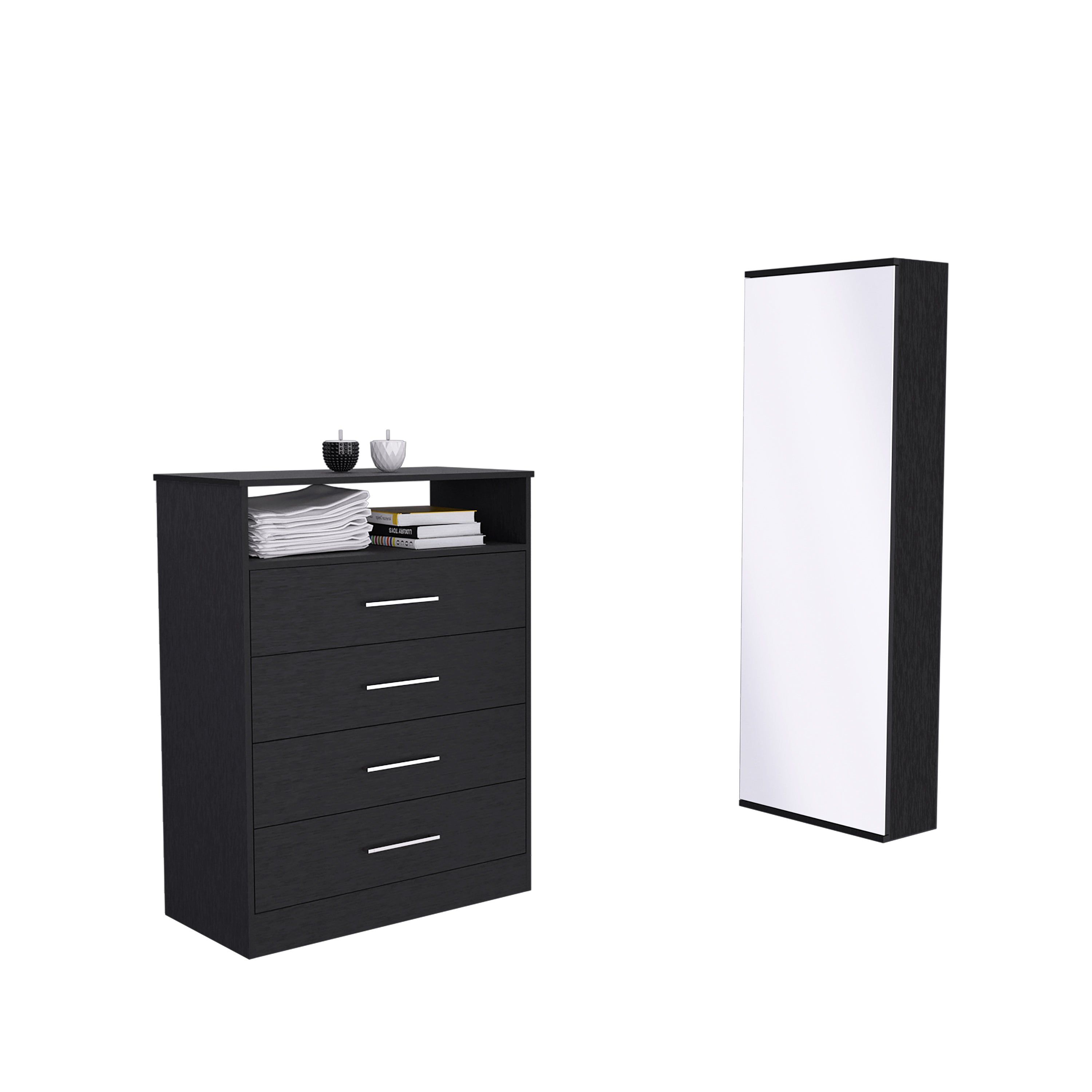 Discover the epitome of style and functionality with the Elwood 2 Piece Bedroom Set. This distinct duo, comprising a sophisticated Drawer Dresser and a streamlined Shoe Rack, is a testament to masterful design. Crafted with premium black manufactured wood, the set exudes timeless elegance and exclusive sophistication. The drawer dresser offers ample room for your clothing, ensuring your treasures are stored with the respect they deserve. Complementing it perfectly, the shoe rack provides an orderly haven for your footwear collection. Meet the Athens Dresser, where functionality meets style. It has four spacious drawers with sleek handles (7,5"H X 29,6"W), so it effortlessly organizes your wardrobe. The included open shelf (29,6"W X 6,4"H) is perfect for showcasing decor or storing essentials. Topped with an ample surface (31,4"W X 14,7"D), this dresser is a versatile addition, bringing both storage solutions and aesthetic appeal to your bedroom.The Connecticut Wall Mounted Shoe Rack blends fashion and function that elevates any wall space. Crafted with an intelligent design, this rack has room for 10 pairs of shoes, keeping your collection neatly organized and within easy reach. Its crowning glory is a generous mirror door (54.3"H X 18.5"W), adding depth to your room while providing a suitable spot to check your look. Dimensions:Furniture 1, Athens DresserWidth: 31,4'Height: 43,2'Depth: 14,7'Furniture 2, Connecticut Shoe RackWidth: 17,7'Height: 42,4'Depth: 16,2'