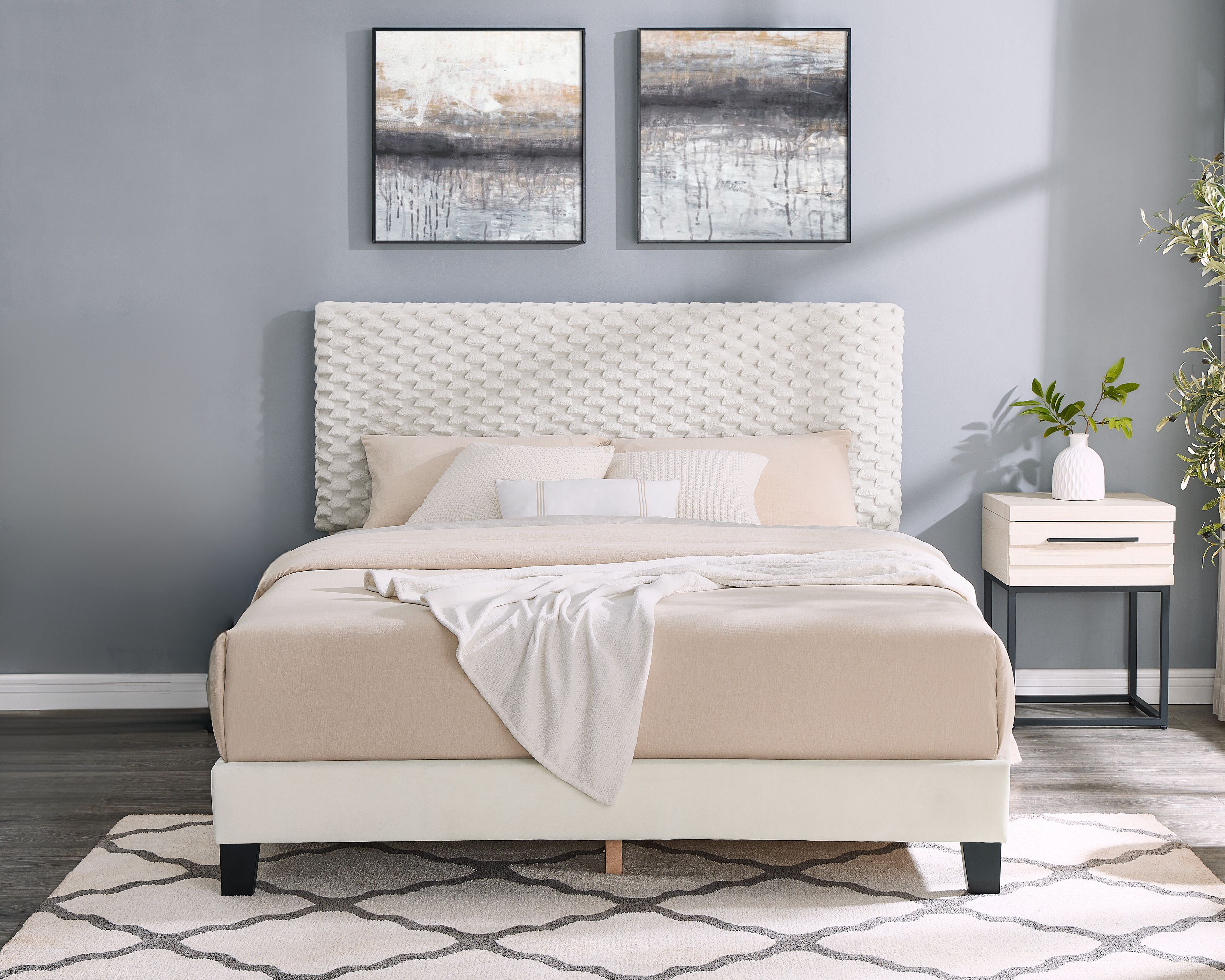 ➤ [LUXURIOUS COMFORT]: The headboard features a plush 3D upholstered design in white dove color, creating a sophisticated focal point that complements any decor style.