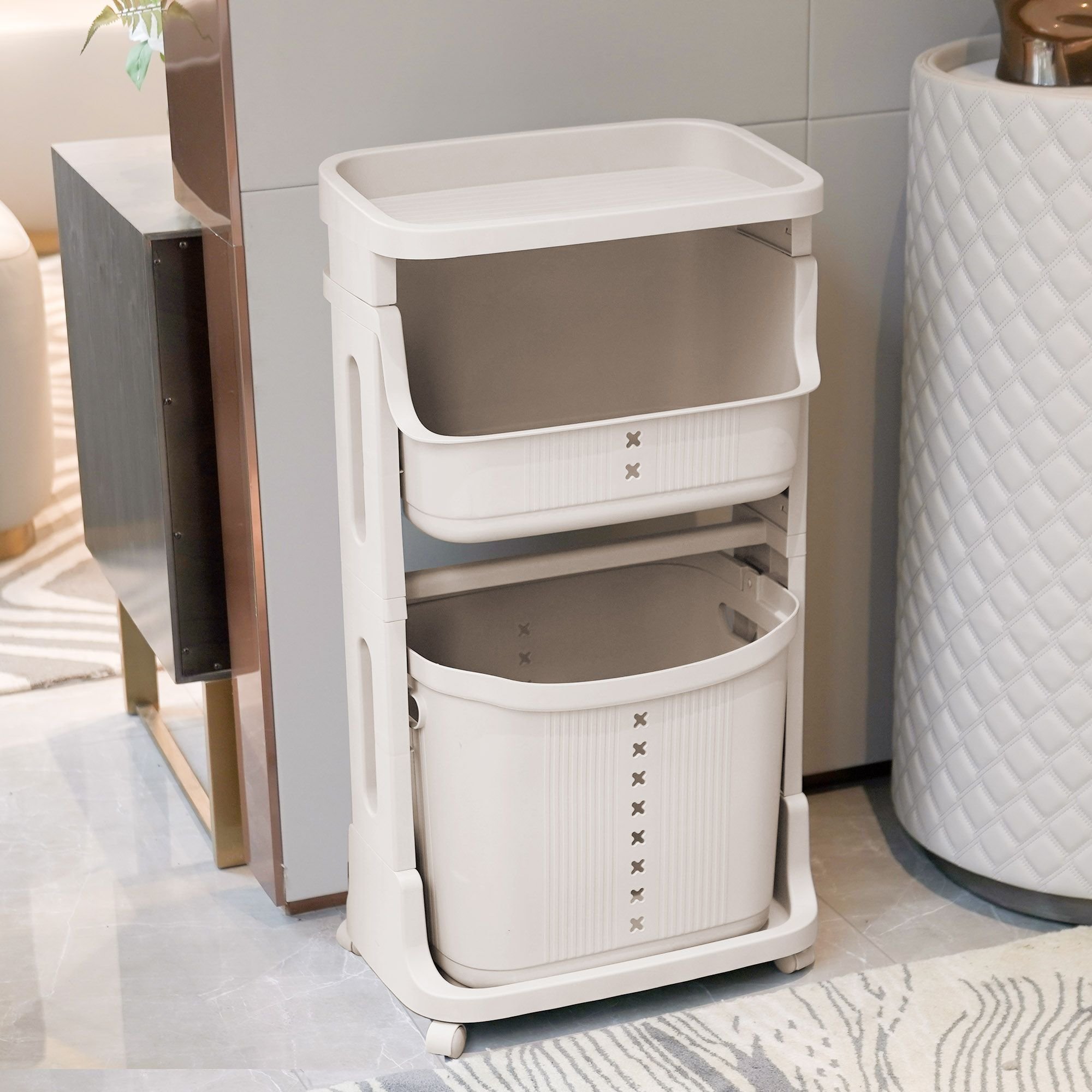 1.Laundry Basket Plastic Hamper 2-Tier Storage Sorter Hampers with Wheels for Kitchen Bedroom Bathroom Free Standing Storage Baskets