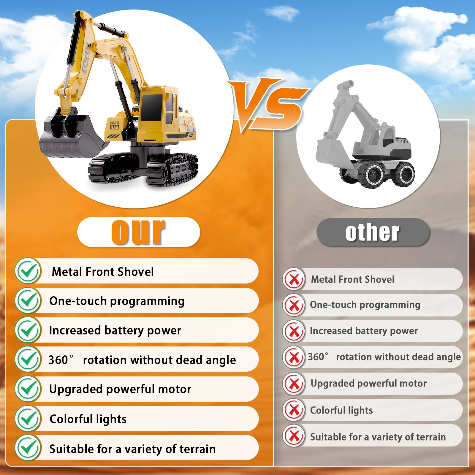 This excavator laughs at terrain limits. As shown, it conquers grass, plush carpets, slopes, and sand with ease. The ABS-alloy tracks grip surfaces, letting it climb small inclines or glide over soft grass. Whether your child builds a backyard "construction zone" or you set up an indoor obstacle course, it powers through – no terrain is too tough for this mini beast.