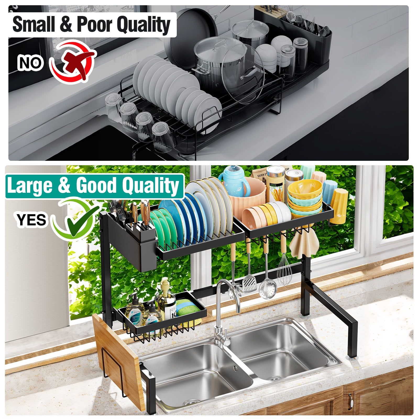 Home > Steel iron Over-the-Sink Dish Drying Rack, Adjustable Width, Multifunctional Kitchen Organizer, Black