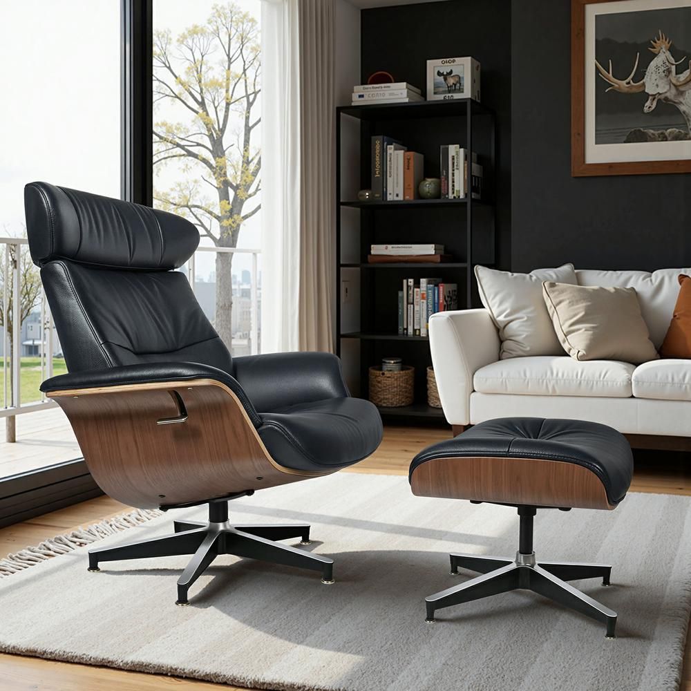 Ultra-modern relaxation. This modern recliner and ottoman set features contemporary lines and a mid-century modern look. Upholstered in genuine leather, it offers a luxe feel and a timeless look that complements any room. The manual reclining mechanism allows you to find the ideal position with two adjustable options. Its 8 Layer plywood frame and metal legs provide a stable base, while the foam-filled seat and back ensure ultimate comfort. Plus, its adjustable headrest adds extra support as you lean back and unwind.