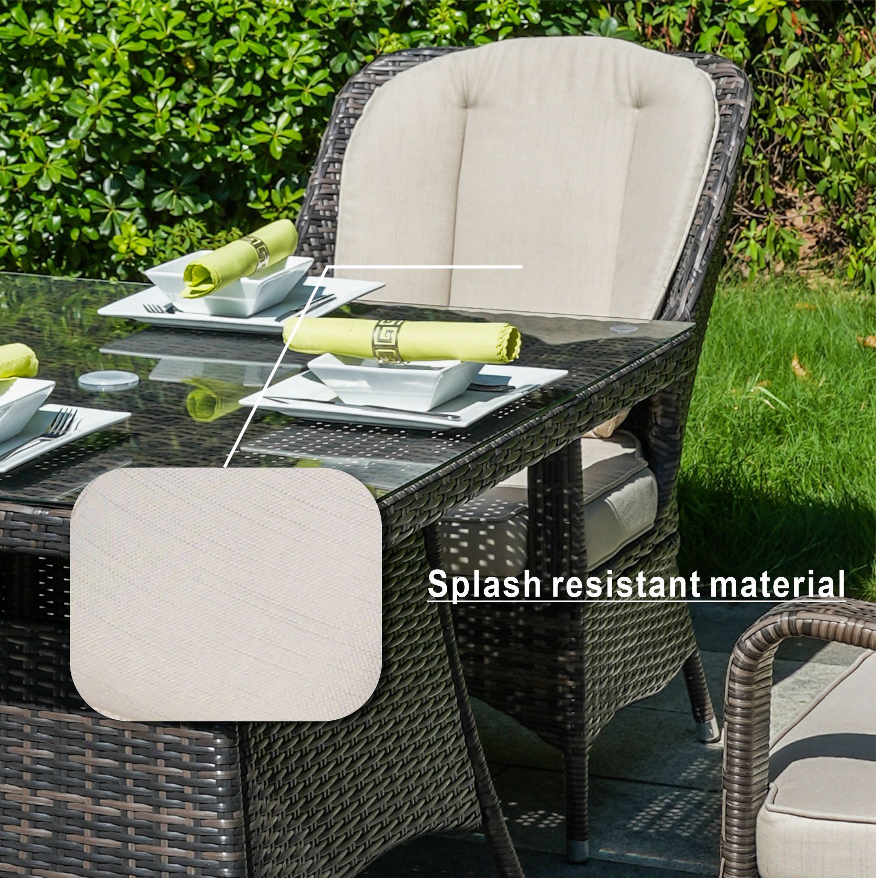 This deluxe dining set with 4 curved chairs offers supreme comfort; grandeur and sophistication for your garden. Made with the highest quality hand-woven rattan; the Malachi dining set comes complete with tempered glass and seat cushions. With its square table and cozy chairs; the Malachi garden set is perfect for intimate alfresco dining. The Dining set is low-maintenance; frost proof; rust resistant and weather resistant. High-quality rattan. The rattan dining/lounge set is made from some of the highest grade brown rattan around - you can rest assured that the Malachi has been designed and created to withstand not only the test of time but also the test of elements. Luxury high-quality cushions. The cushions on the Malachi are durable and supremely thick; providing you with unparalleled comfort. The cushions are made from luxury fabric and also contain quick drying foam with washable covers; making them excellent for year round usage.