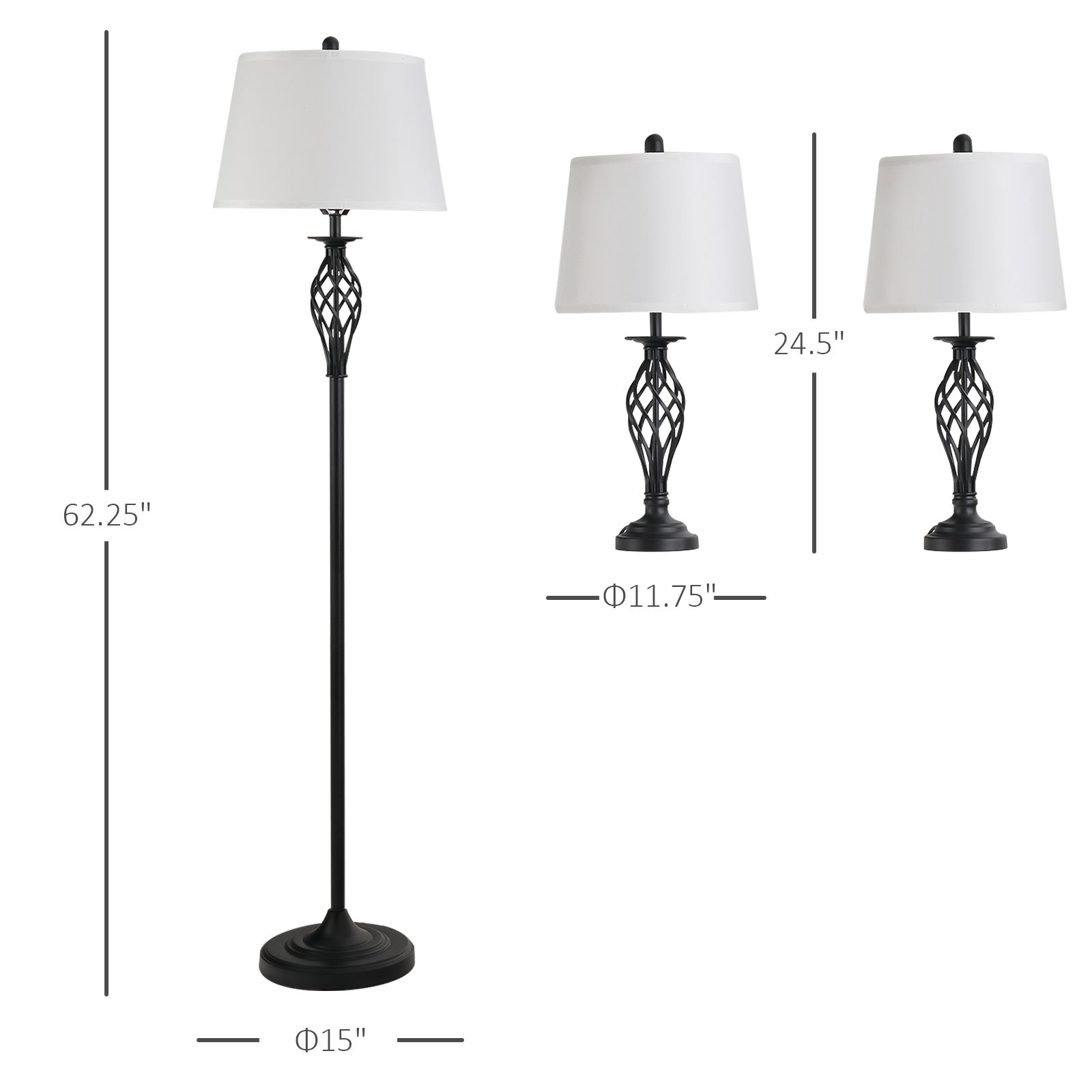 • - Overall Dimensions: Ф15'' x 62.25'' H(floor lamp), Ф11.75'' x 24.5'' H(table lamp)