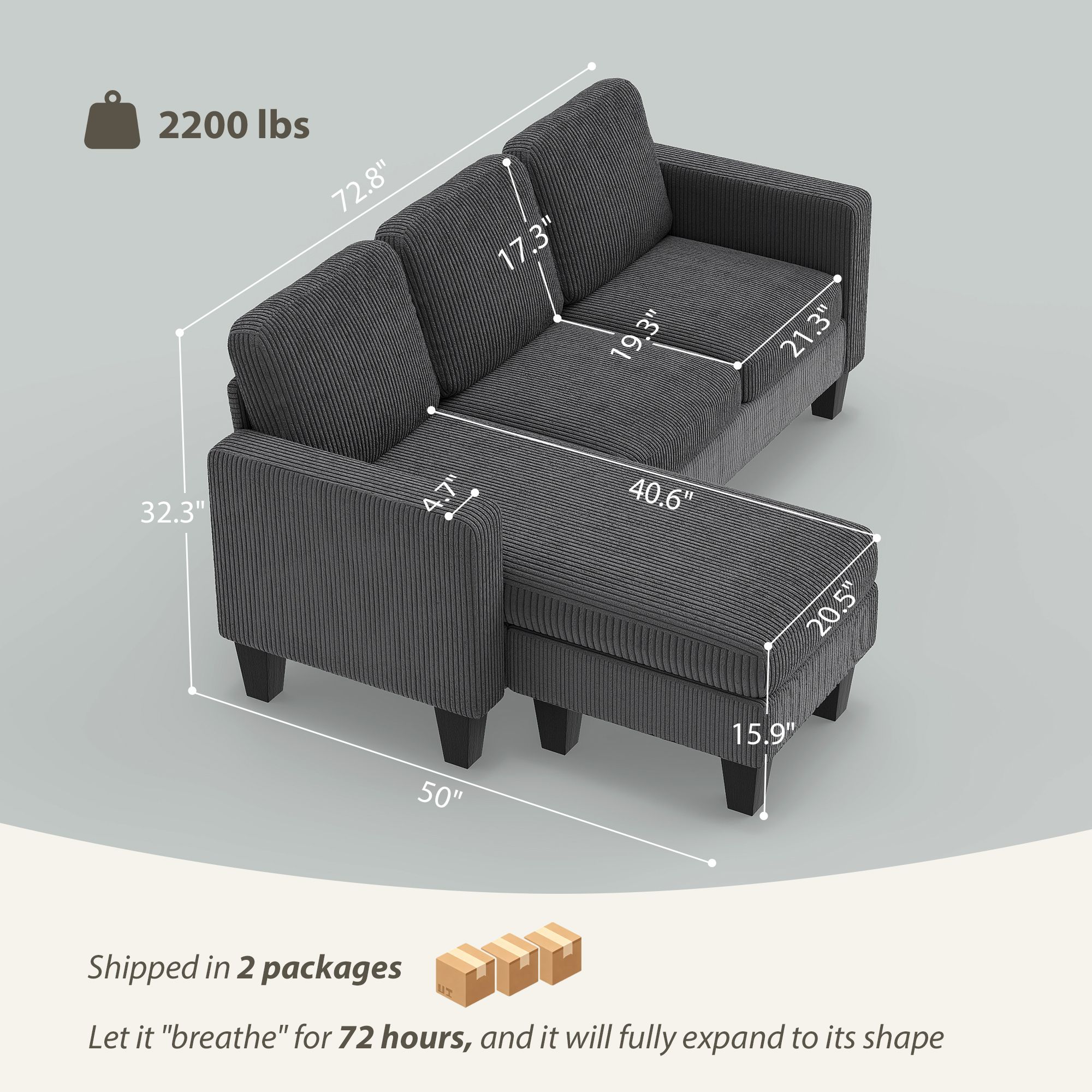5.Quick Setup, Zero Stress: With clear instructions, this sectional sofa can be assembled by two people in around 20 minutes. Less time assembling means more time enjoying your new sofa
